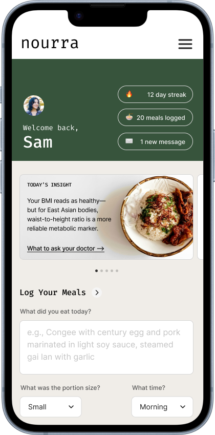 Nourra is a culturally-informed health companion providing personalized guidance and insights grounded in evidence-based practice and shaped by lived experience. Developed alongside medical, health, and cultural advisors—and co-designed with the communities it serves—every feature exists for one reason: to make culturally-informed metabolic care feel accessible, personal, and built for you.
